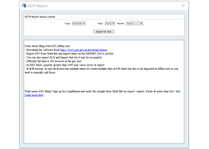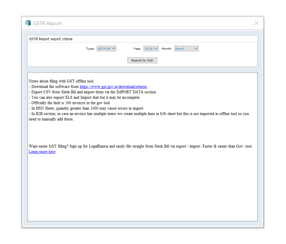 In Sleek Bill, on your dashboard, on the right hand side, go to GSTR Reports (under Tools). In Type, select GSTR 3B and pick the year and month for your report. You can either export it in Excel in a .XLS or .CSV file, or you can export it straight to LegalRaasta, where you can file it online. Your GSTR Report has instructions on how to file your GST reports via the government GST offline tool.