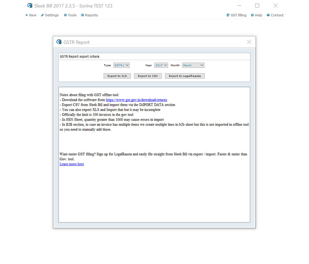 In Sleek Bill, on your dashboard, on the right hand side, go to GSTR Reports (under Tools). In Type, select GSTR 1 and pick the year and month for your report. You can either export it in Excel in a .XLS or .CSV file, or you can export it straight to LegalRaasta, where you can file it online. Your GSTR Report has instructions on how to file your GST reports via the government GST offline tool.