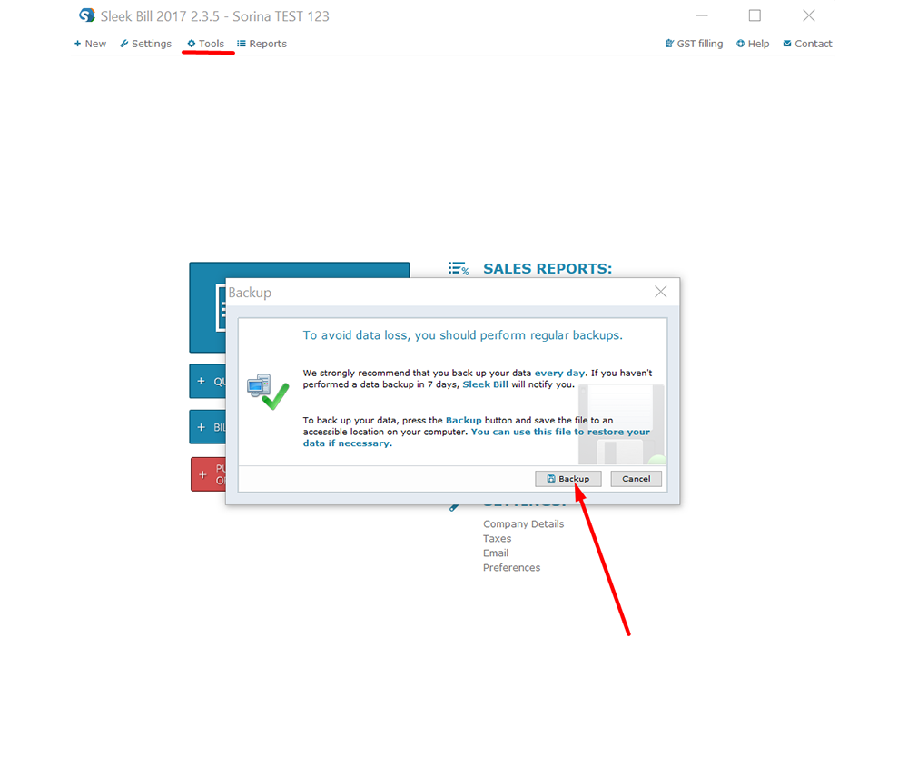 In sleek Bill go to Tools - Backup Data and click on “Backup” when prompted. Pick a safe location on your computer and click on Save. Make sure you regularly make backups of your company data so that you cannot lose it. Remember this is an offline software, so all data is safely stored in your computers. If you wish to check an online billing software where your data is kept in the cloud and safe from any computer issues, go here.