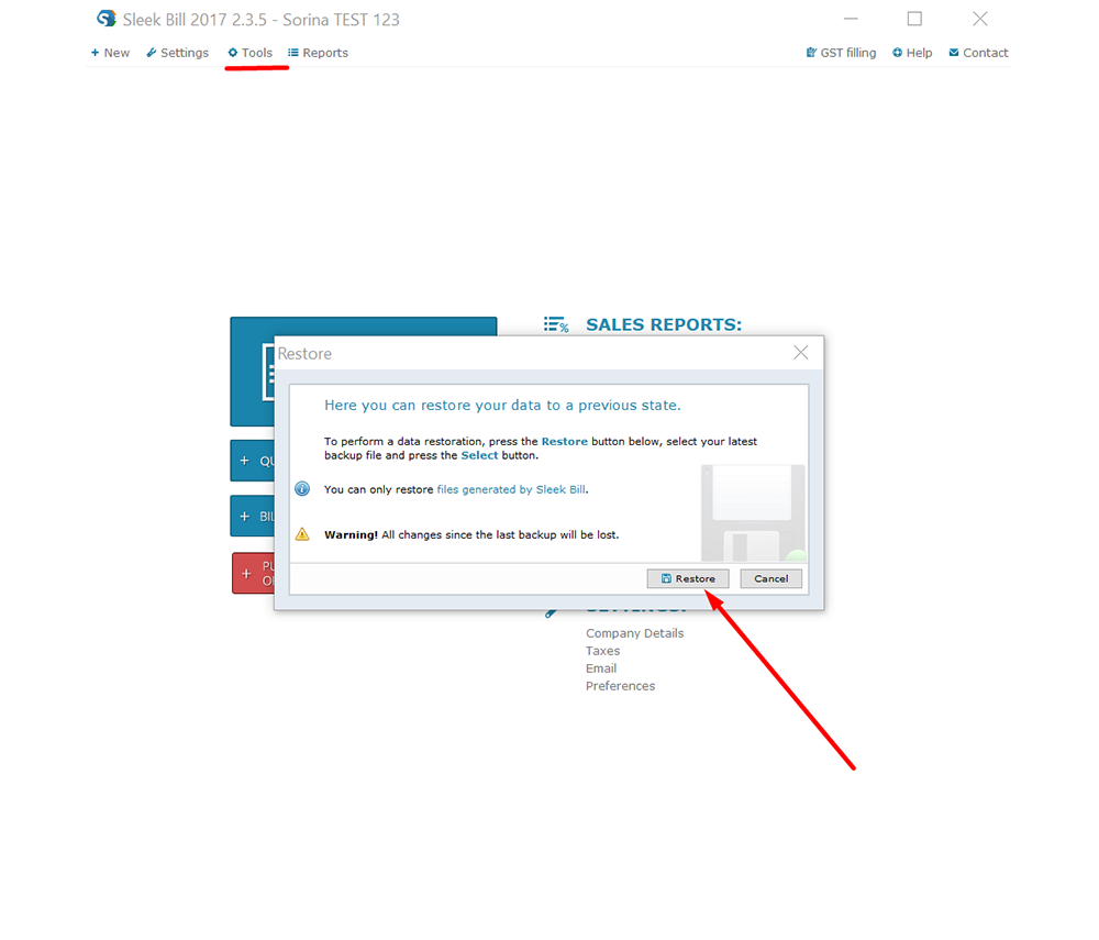 In sleek Bill go to Tools - Restore Data and click on “Restore” when prompted. Select your Sleek Bill backup file from where you saved it and click on “Restore”. In a few seconds your company data will be restored and you can resume billing with your data. .